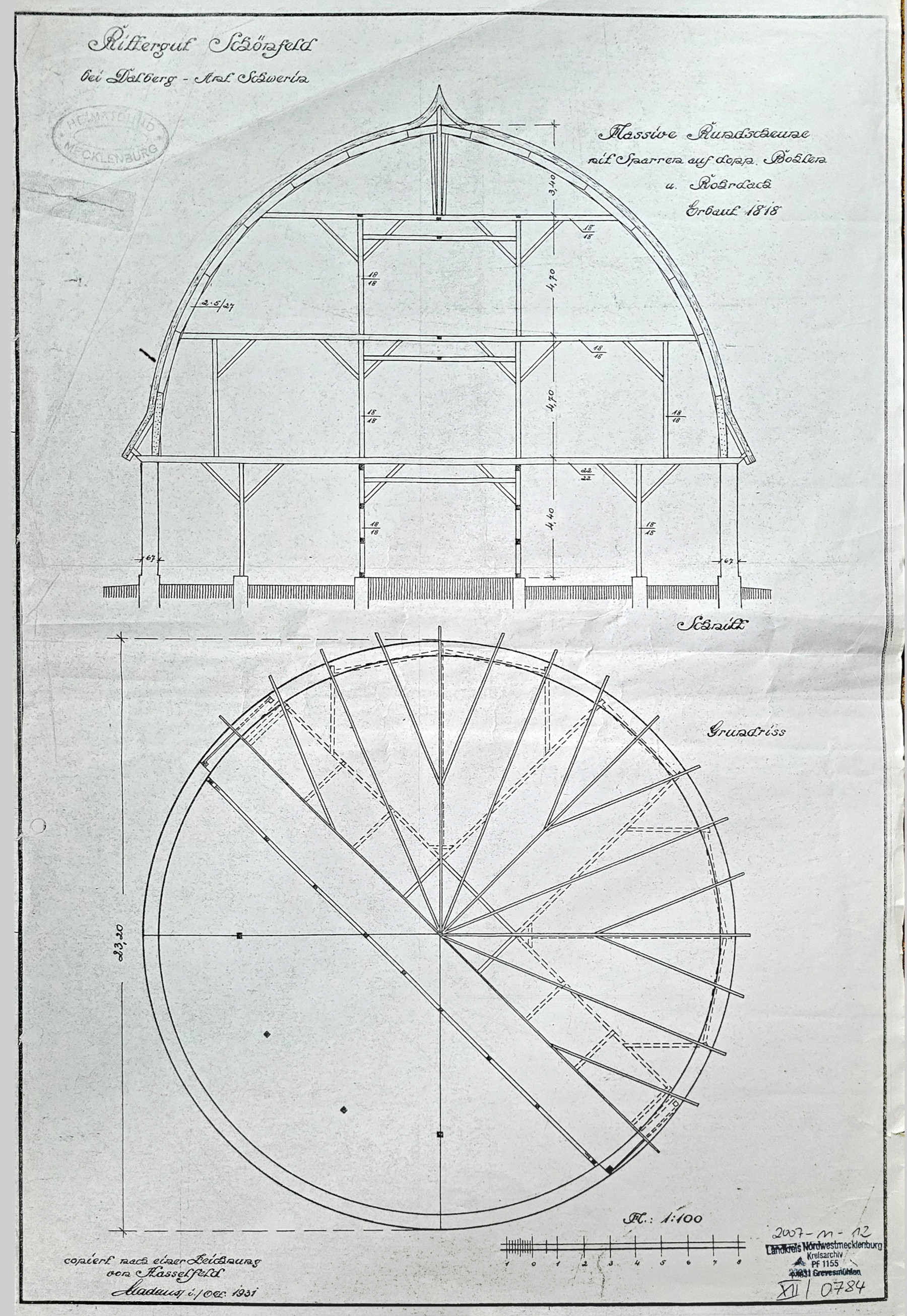 Darin enthalten und eingezeichnet beide Rundscheunen mit Nr. 12 und 13 und jeweils 80 Fuß im Durchmesser. Folgen wir der Quelle von Joh. Beltz „Anschlag von Fehlendes Tannen Bauholz zu die beiden Scheunen auf Schönfeld“ unterschrieben von dem Gadebuscher Zimmerermeister J. Fr. Reiher aus dem Jahr 1818, besteht immerhin die Möglichkeit das hiermit unsere Rundscheunen gemeint sind.