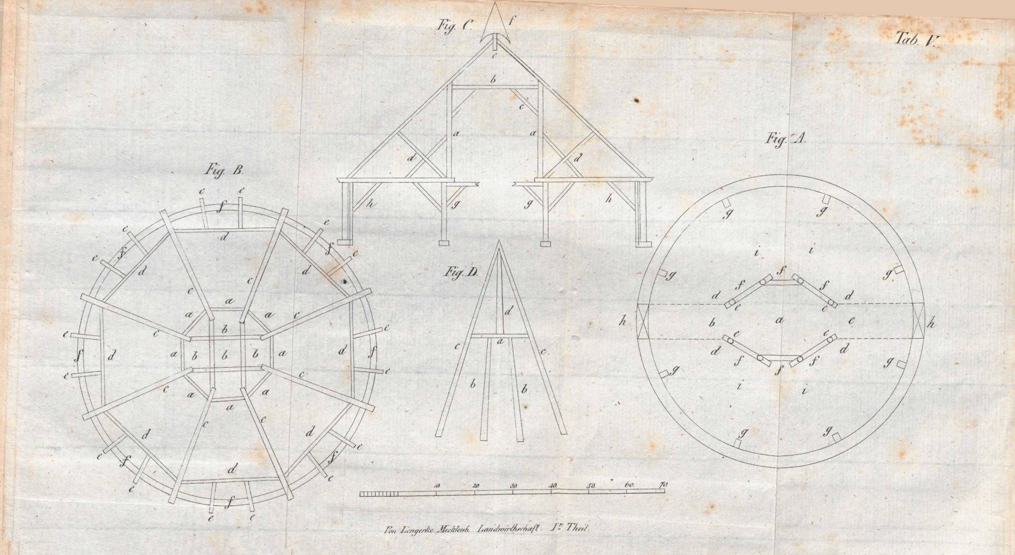 „Abbildung und Beschreibung, eines wenig kostbaren und dauerhaften runden Wirthschaftsgebäudes, von 76 Fuß im Durchmesser und 15 Fuß Stielhöhe.